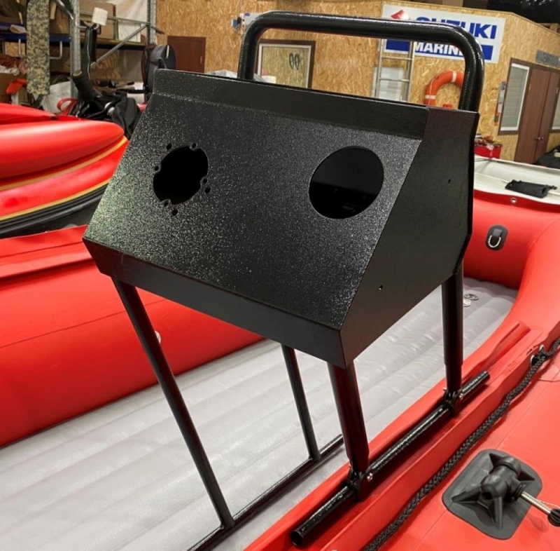 Боковая рулевая консоль для ПВХ лодок. Материал алюминий, труба 22 мм, стенка 3 мм, листовой АМГ5 3 мм,  порошковая полимерная окраска.  Оснащена удобной полкой, ветрозащитным стеклом из поликарбоната. Вырезано крепление рулевого редуктора, удобная жесткая площадка для крепления машинки газа\реверса. Вес всего 4 кг.