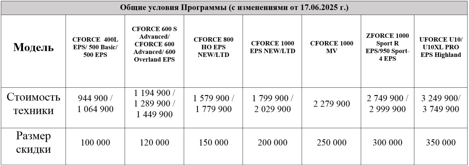 Согласно условиям Программы, Вы можете сдать Дилеру CFMOTO в зачет на условиях «TRADE-IN» любой квадроцикл ATV или мотовездеход Side-by-Side любого бренда с объемом двигателя свыше 350сс и имеющий ПСМ, при этом Дилер оценивает б/у квадроцикл с учетом его износа и рыночной стоимости и снижает на эту сумму цену на выбранный клиентом новый квадроцикл CFMOTO. Кроме этого, Покупатель получает дополнительную скидку, указанную в таблице: